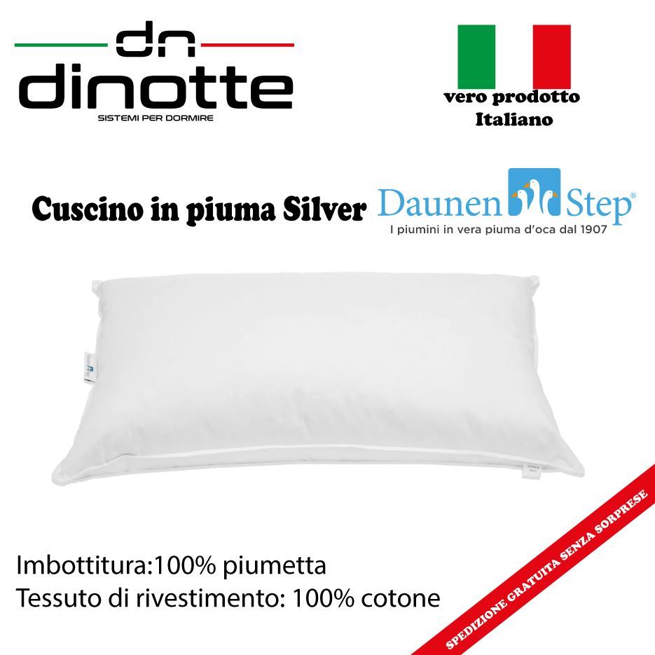 Il cuscino in piuma Silver presenta un’imbottitura in pura piumetta la quale dona un efficace sostegno rendendo il cuscino più compatto. Questa peculiarità favorisce il giusto riposo grazie all’agevolazione di una corretta postura della colonna vertebrale. Inoltre, con la loro naturalezza al 100%, la traspirabilità, l’anallergici e lavabili i guanciali DaunenStep sono ideali per qualsiasi tipo di esigenza. Sono inoltre disponibili due versioni per il cuscino in piuma Silver, una alta e una bassa per chi dorme di schiena e chi di pancia.